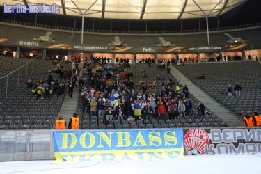 Eine sachlichere und sehr empfehlenswerte Einleitung findet Ihr wieder auf dem HfA Blog und im heutigen Kurvenecho. Im Gästeblock fanden sich wenige Hundert Fußballfans ein, vor dem Gästeblock hingen einige Zaunfahnen. Auffällig war besonders die „Donbass Ukraine“ Fahne in westlichen Lettern. Die wenigen Fans (woher auch immer sie kamen) hatten viele nationale Ukraine-Fahnen mit, was zum politischen Auftritt passte. Gesehen habe ich aus der Ferne auch ein paar Klatscheinlagen.