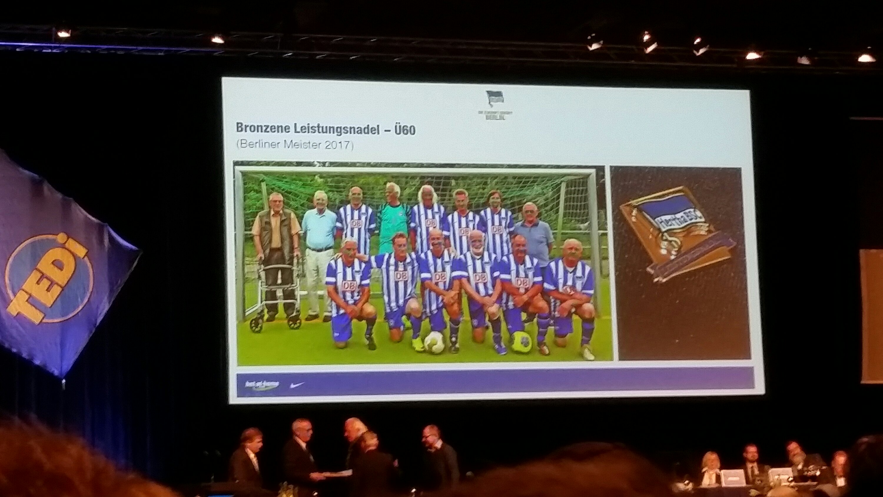 MM 19:24 – Es ist Zeit für Ehrungen. Herthas Ü60 erhält die bronzene Leistungsnadel für das beste jemals geschossenene Mannschaftsfoto.