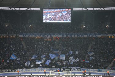 Und wenn Ihr mal irgendwo nicht dabei sein könnt, erwarte ich wenigstens eine ähnliche Geschichte! Wir waren inzwischen im Roten Wedding angekommen und besuchten Dr. Tile, den ein Brechdurchfall, ja lest das schöne Wort nochmal, ein Brechdurchfall niedergestreckt hatte. Bepackt mit dem Tifo-Kram ging es zum Olympiastadion, wo ich eingedenk des Großkampftages über die Zurückhaltung der Bullen verblüfft war. Döri wusste zu berichten, dass die allesamt die Frankfurter bewachten. Nach einem kurzen Schnack mit Kreisel, der wegen des bescheuerten SV’s natürlich scheiße drauf war, ging es rein und ich hörte noch aus dem Hintergrund Prophet Fab „Hertha gewinnt 3:1“ rufen. Wenn das mal gut geht, dachte ich mir und ging zum traditionellen Fahnenaufbau.