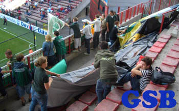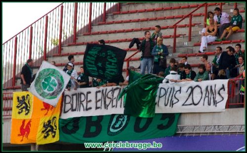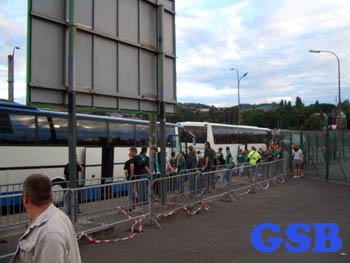 Das Sclessin liegt etwas abseits der Stadt in einem noch graueren Industriegebiet. Stadionöffnung ist, zumindest für Gäste, erst ne Stunde vor Anpfiff und die Preise haben deutsches Niveau. 18Euronen kam ne Karte, ein stolzer Preis, wenn man bedenkt das in Belgien Fußball nicht den Stellenwert hat wie bei uns. Zu erwähnen ist das die Einlasskontrollen sowas von lächerlich sind, das ich mich frage warum die überhaupt durchgeführt werden. Abtasten wäre wohl das falsche Wort dafür, streicheln trifft es wohl eher. Die Ultras aus Brugge hatten auf Ihrer Zugfahrt nen Studenten aus Schweden kennengelernt, der ne Rucksacktour durch Europa macht. Der ist mitsamt seinem Kram, Messer und Ghettoblaster in den Block. Alles kein Problem. Dagegen wurde den Ultras verboten DH´s mit rein zu nehmen. Erst nach einigen Diskussionen war es dann plötzlich OK. Ins selbe Bild passt, das ne Blockfahne völlig unkontrolliert im Plastikbeutel durchkam.