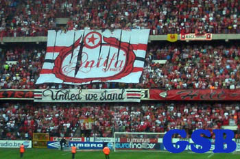 Bei Anpfiff präsentierte die Standardkurve eine Choreo die Ihre Verbundenheit mit der Antifa darstellte. Eine Blockfahne mit Antifa Logo + Spruchband „United we Stand“. Auf Cercleseite wurde besagte Blockfahne präsentiert, die genau wie die kombinierte Fahne nochmals die Freundschaft zum FC Lüttich manifestierte