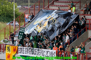 Die Heimkurve war zumindest am Anfang immer in Bewegung und die Hüpfeinlagen liefen über alle 3 Ränge. Brachialisch laut wurde es bei Wechselgesängen mit PHK im Nebenblock oder wenn die Tribünen mitsangen. Die Supporter von Cercle versuchten mit Gesang, Trommeln und Hüpfeinlagen dagegen zu setzen, aber es fiel schwer bei den Wenigen die sich daran beteiligt haben. Auf Gästeseite wurde es etwas lauter als in der 34. Minute der Anschlusstreffer durch Oleg Iachtchouck fiel. 2:1, Geht doch noch was? Wir hatten die Hoffnung, allerdings betrug dann kurz vor Halbzeit der Abstand wieder zwei Tore.