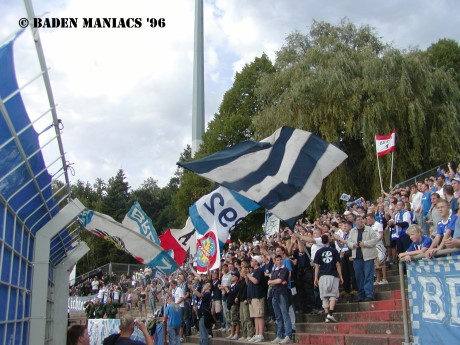 Darmstadt ist eine graue Stadt im westen der Republik. Mehr brauch man glaub ich zur Architektur nicht sagen. Wir wurden an allerlei Fussballvolk vorbei direkt zum Gästeblock gekarrt. Da stand auch gleich ein grüner Megaphonmann der wichtigeren Sorte und erklärte pausenlos das wir in den Wald müssten. Direkt vor dem Stadion wurde dann eine kleine Gruppe herausselektiert und mit den Händen auf dem Rücken an die Wand gestellt. Zitat Greenfreak XY: „Eine ganz normale Kontrolle, bei Fussballspielen, gehen sie bitte weiter“. Natürlich blieben wir! Per „Zufallssystem“ wurden 15 Karlsruher und 2 Berliner ausgewählt und inmitten von Brennnesseln „kontrolliert“. Eine weitere unglaublich sinnlose Schikane mehr auf einer langen Liste..
